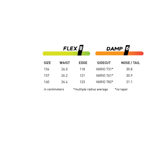 Vario Power Grip Sidecut: Спеціальна форма бокового вирізу "Vario Power Grip", яка працює виключно разом з "Rocker Camber", задіює відразу кілька радіусів: практично в прямий кант по центру сноуборду між ніг (в зоні "негативного прогину"), є зоною постійного стійкого контакту, водночас без навантаження та скручування дозволяє тримати пряму лінію чи ефективний траверс. Відразу на майданчиками кріплень йдуть два неглибокі (великі радіуси), що створюють ще 2 контактні зони. І нарешті, в районі ефективної робочої зони розташовані найбільш агресивні радіуси, що дозволяють швидко увійти до дуги.