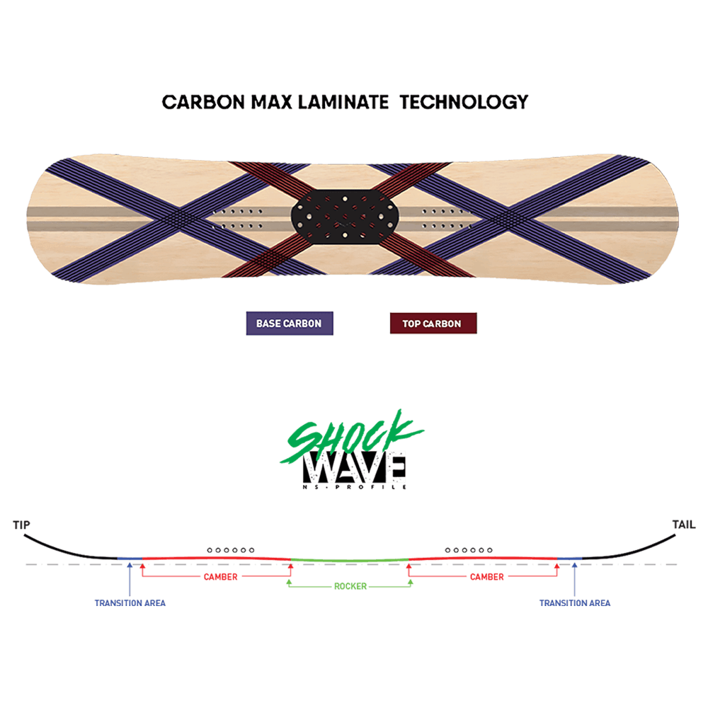 Carbon MAX Laminate Technology: Більше карбону = більше потужності та віддачі, точніше контроль. Системи підсилення Carbon Max Laminate Technology: об'єднує підсилення в кришці та під сердечником в одну матрицю – для максимального торсійного контролю та сили – саме там, де вона Вам потрібна. Результат - легка, але потужна конструкція, що заряджає ваш сноуборд на багато сезонів!